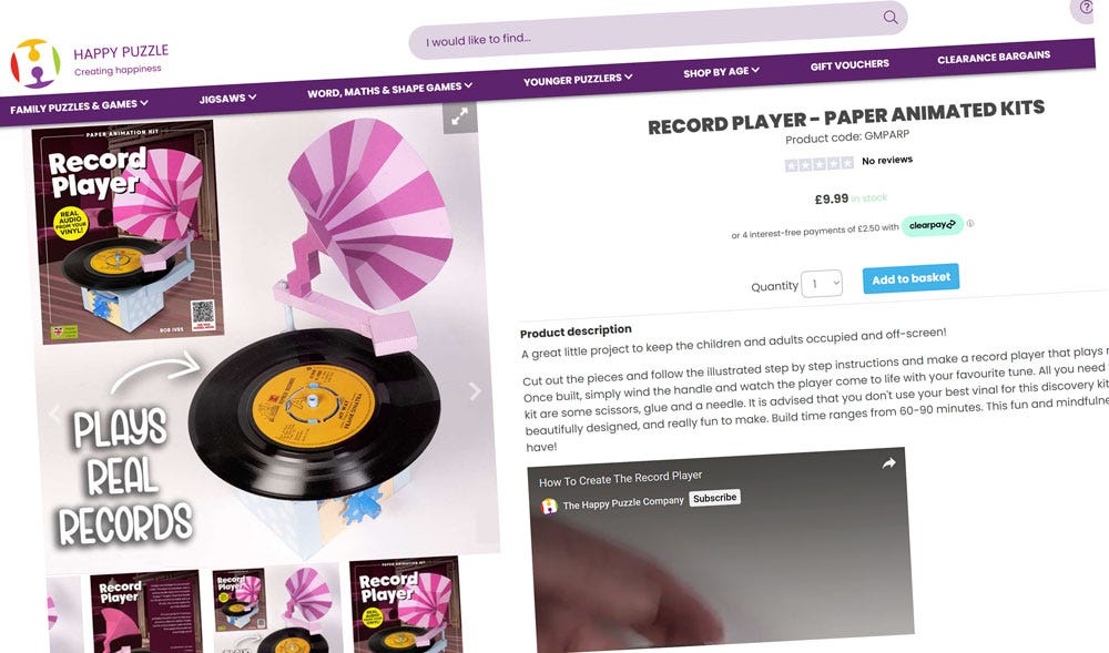 The Record Player Kit is printed by my friends over at Go On Make Me, and it’s available online from Happy Puzzle, visit Happy Puzzle to get yours. While you’re browsing, why not take a peek at my other printed kits too? It’s a great gift, a fun afternoon project, and a brilliant way to make something that actually plays music!