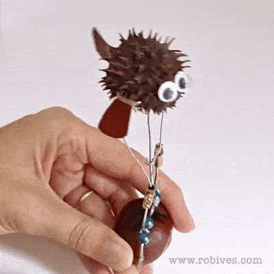 And so to the final result. The flippers, cut from suitably coloured leaves, are linked to the main arch of the mechanism by a pair of push rods. As the crank turns, the fish’s body bobs up and down, sending the flippers into a cheerful flap. I’m absolutely delighted with how this little critter has turned out! There’s something deeply satisfying about combining natural materials with a simple, elegant mechanism, the glossy conker base, the leaf flippers, the glint of wire and bead all working together to bring it to life. It’s playful, tactile, and surprisingly expressive. A proper autumnal automaton.