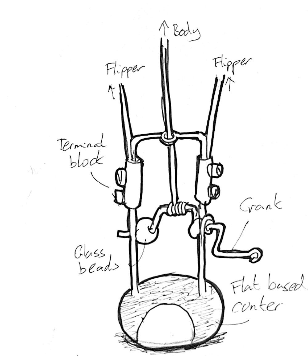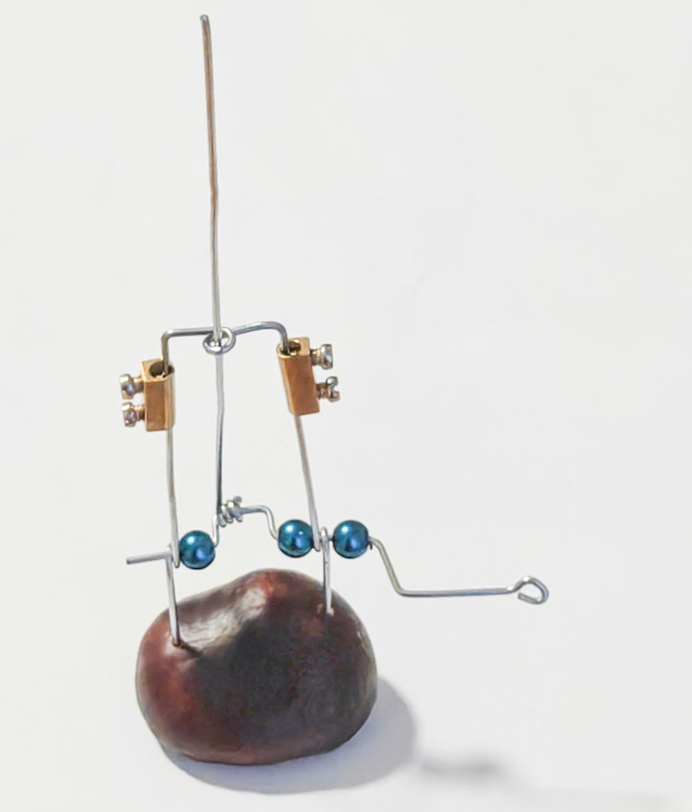 Back in the room, I cracked open my sketchbook and jotted down the outline of an idea, then rooted around in the tool bag for pliers, paper clips, and glass beads. Unusually for me, the first draft of the mechanism matched the sketch almost exactly. My only hiccup was forgetting to thread on the terminal blocks before adding the crank loops. No way around that, I had to remake the main arch of the mechanism, this time fitting the terminal blocks first, then folding the crank loops. I used a small drill bit in a pin vice to make suitable holes in a flat-based conker and pieced it all together. The resulting mechanism came out pretty well!