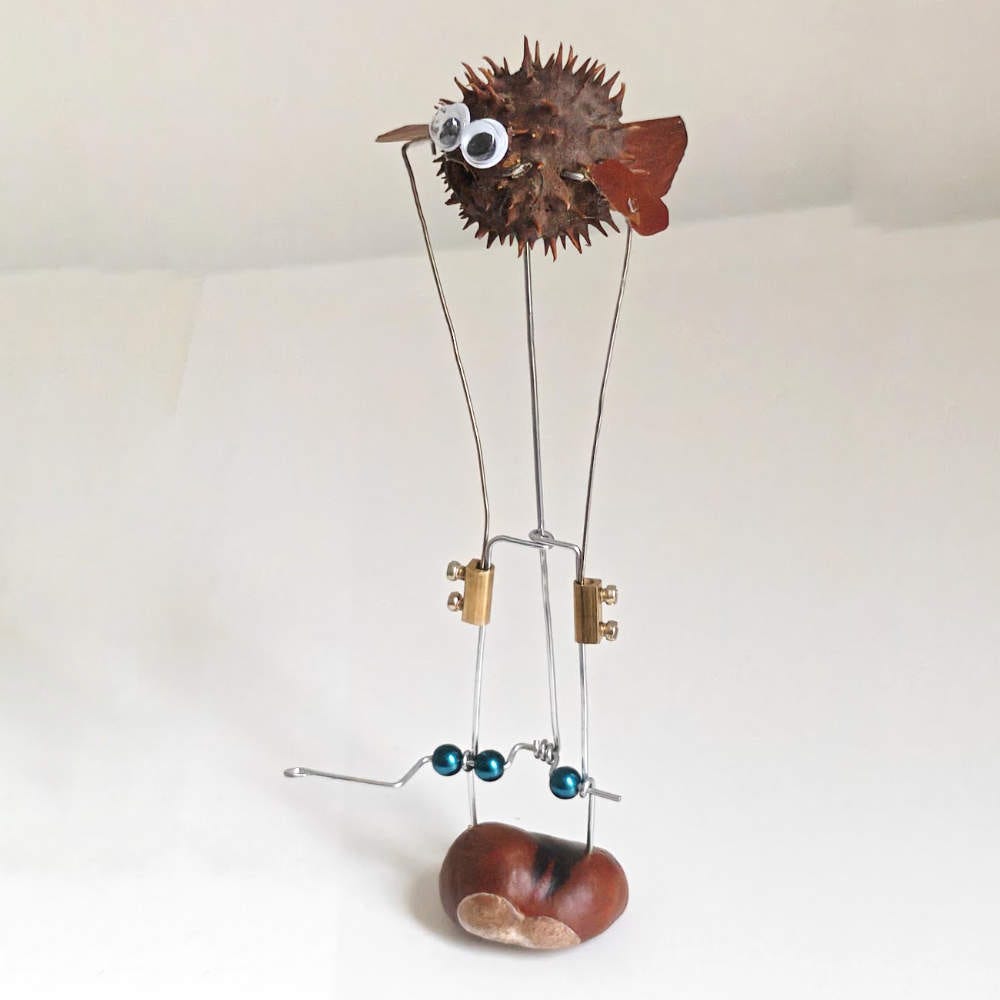To make the puffer fish, I trimmed a few spikes to make room for googly eyes (everything looks better with googly eyes!). Wire staples served as neat little hinges for the flippers and tail, which I carefully fitted into place, one satisfying press at a time.