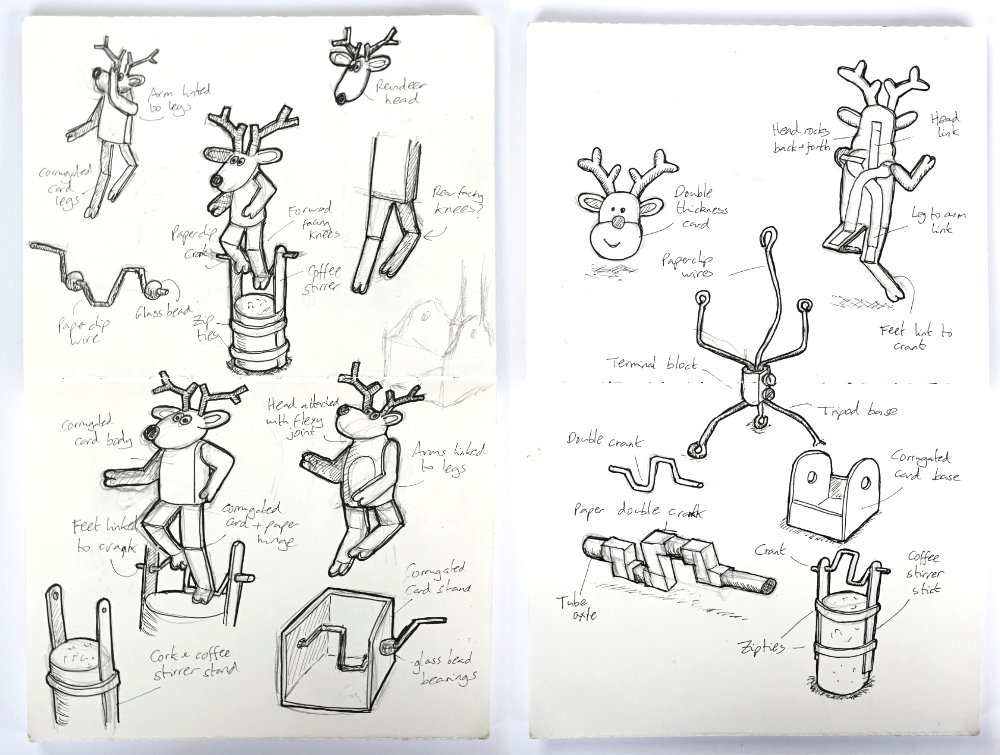 Before starting the build, I spent some time sketching out different ideas for the base, you can see a few of those explorations in my notebook pages above. In the end, I returned to the tried‑and‑tested bead‑and‑wire mechanism. Past experience told me it would work reliably, and with Christmas fast approaching I wanted to be sure the project would be finished in time.