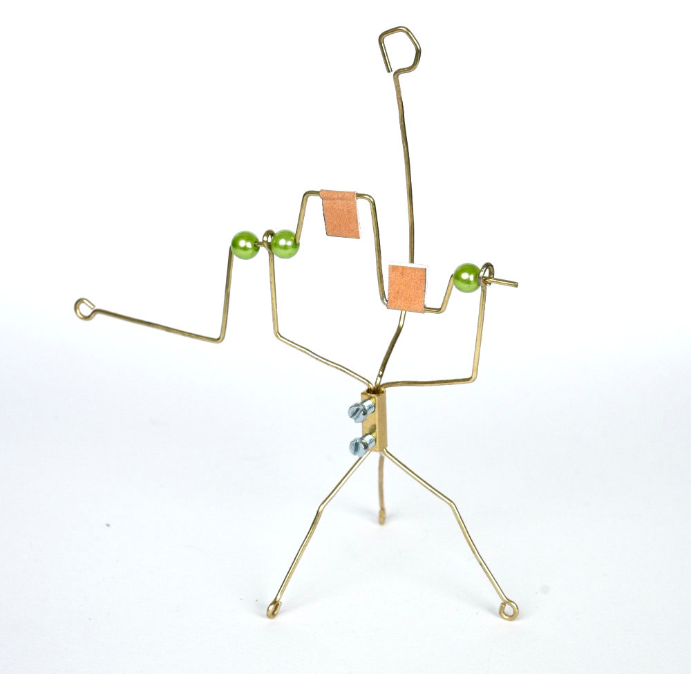 The base is crafted from straightened paperclip wires, bent neatly into shape and joined with a small piece from a terminal block. The crank slots into a pair of wire loops, while two glass beads hold it centred and turning smoothly in position.